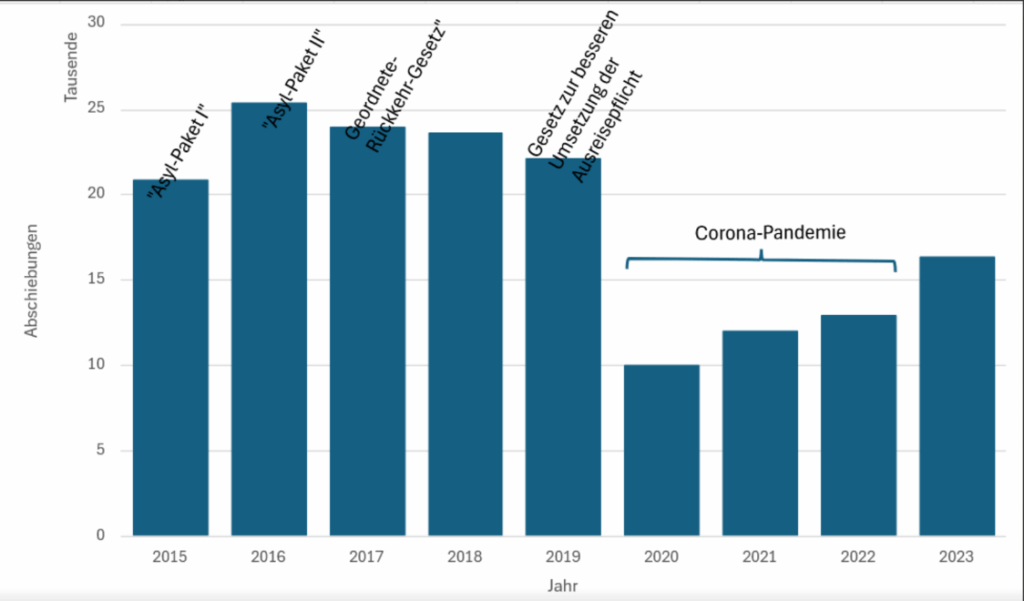 - Trotz der vielen und weitreichenden, gesetzlichen Verschärfungen der letzten Jahre, die die Abschiebung ausreisepflichtiger Menschen erleichtern sollten, führten sie jedoch nicht zu einer Erhöhung der Zahlen.